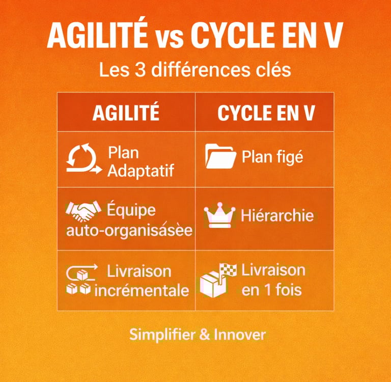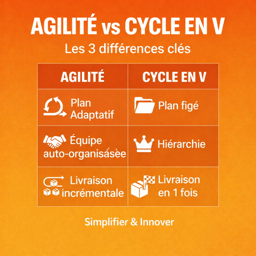 Agile vs Cycle en V : quelles différences réelles entre ces deux approches de gestion de projet ? Découvrez une matrice simple pour comprendre leurs avantages et limites.